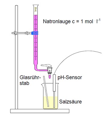Es werden 10 ml Salzsäure in ein Becherglas gegeben. Mit destilliertem Wasser wird soweit aufgefüllt, dass der pH-Sensor ausreichend in die Lösung eingetaucht werden kann. Titriert wird gegen Natriumhydroxidlösung (c = 1 mol  l1). Nach Zugabe von jeweils 1ml Natriumhydroxidlösung wird eine pH-Wert-Messung durchgeführt.